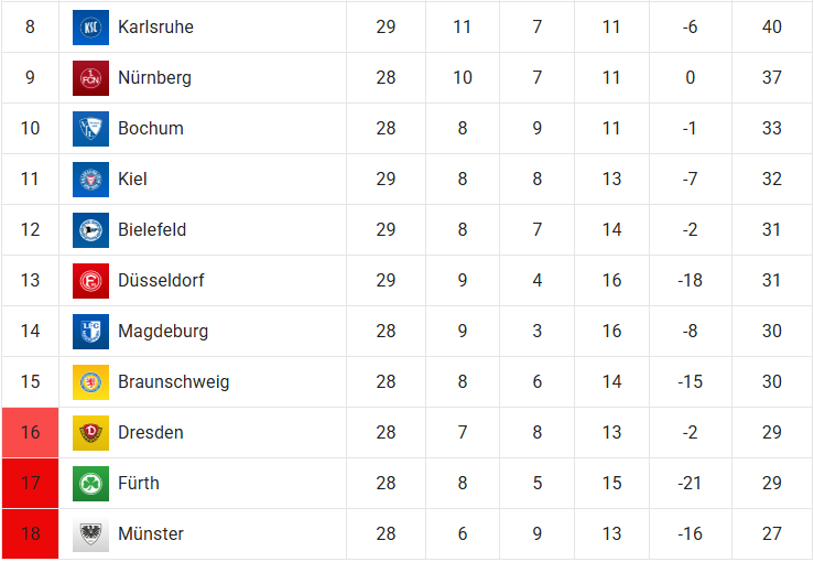 Le Dynamo Dresden se déplace à Nürnberg et, en cas de victoire, pourrait grimper à 32 points et dépasser à la fois Bielefeld et Düsseldorf.