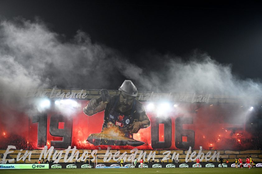 BERLIN, GERMANY - JANUARY 24: Fans of 1. FC Union Berlin ligth flares behind a tifo during the Bundesliga match between 1. FC Union Berlin and Borussia Dortmund at Stadion An der Alten Foersterei on January 24, 2026 in Berlin, Germany. (Photo by Stuart Franklin/Getty Images)