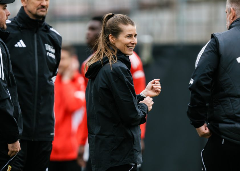 BERLIN, GERMANY - APRIL 14: Head Coach Marie-Louise Eta of Union Berlin, the first female head coach in Bundesliga history, during a training session on April 14, 2026 in Berlin, Germany. Union Berlin has appointed Marie-Louise Eta as the first female head coach in the men's Bundesliga. (Photo by Reinaldo Coddou H./Getty Images)