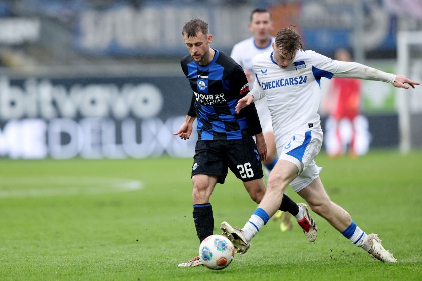 PADERBORN, GERMANY - FEBRUARY 22: (L-R) Sebastian Klaas of SC Paderborn challenges Julian Eitschberger of Hertha BSC Berlin during the 2. Bundesliga match between SC Paderborn 07 and Hertha BSC at Benteler Arena on February 22, 2026 in Paderborn, Germany. (Photo by Christof Koepsel/Getty Images)