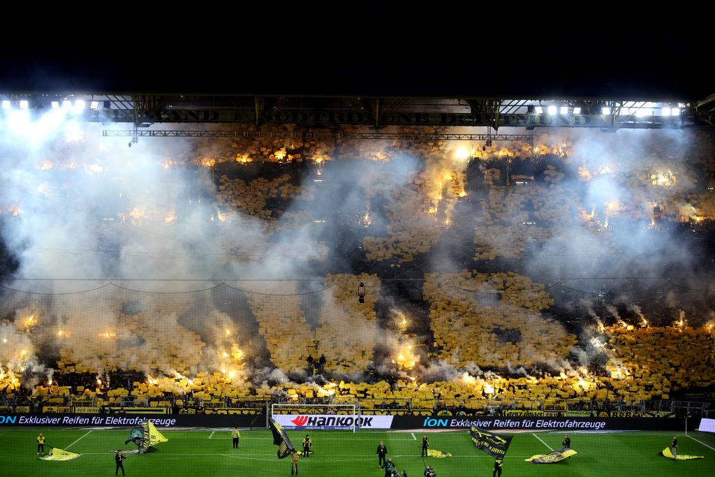 Dans une atmosphère électrique, les supporters du BVB ont recouvert la Südtribune de milliers de cartons jaunes de façon à afficher un « Heja BVB » spectaculaire avant d’allumer de nombreux fumigènes !