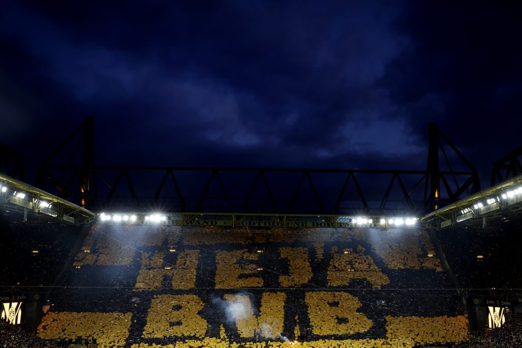 Avant même le coup d’envoi du Klassiker entre Borussia Dortmund et Bayern München, le Signal Iduna Park a offert un spectacle grandiose. La célèbre Südtribüne a déployé un immense tifo noir et jaune accompagné de fumigènes.
