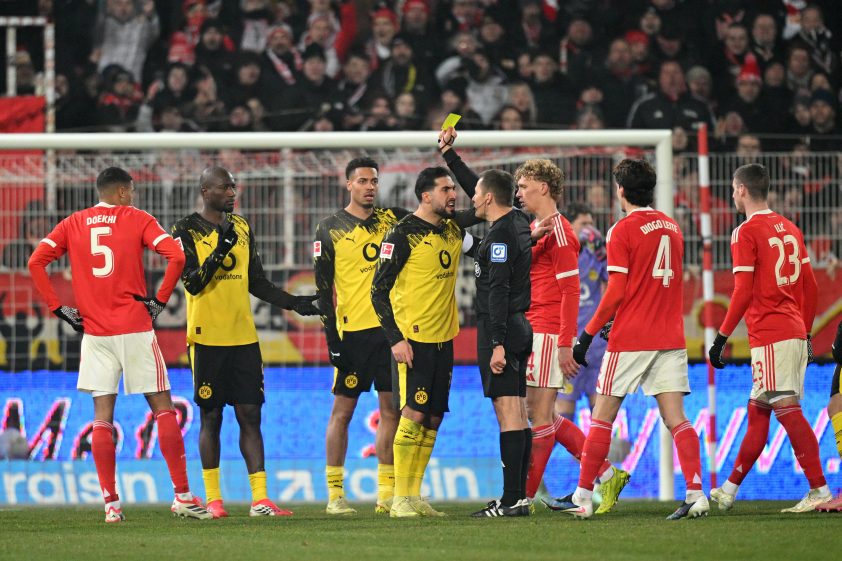 BERLIN, GERMANY - JANUARY 24: Emre Can of Borussia Dortmund is shown a yellow card by referee Robert Hartmann during the Bundesliga match between 1. FC Union Berlin and Borussia Dortmund at Stadion An der Alten Foersterei on January 24, 2026 in Berlin, Germany. (Photo by Stuart Franklin/Getty Images)
