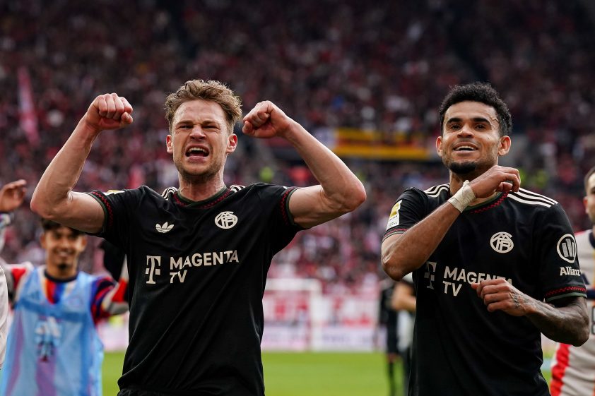 FREIBURG IM BREISGAU, GERMANY - APRIL 04: Joshua Kimmich of FC Bayern Munich (L) and Luis Diaz of FC Bayern München celebrate the victory after the Bundesliga match between SC Freiburg and FC Bayern München at Europa-Park Stadion on April 04, 2026 in Freiburg im Breisgau, Germany. (Photo by Daniela Porcelli/Getty Images)