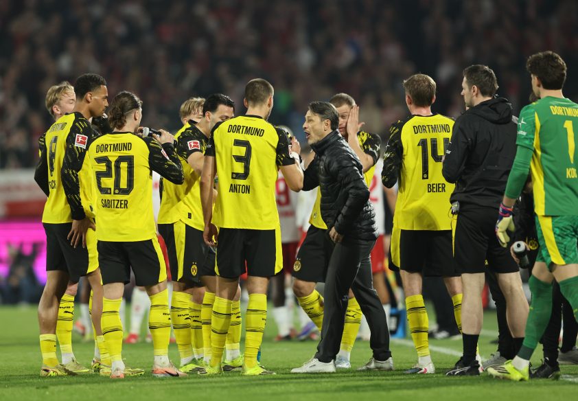 COLOGNE, GERMANY - MARCH 07: Niko Kovac, Head Coach of Borussia Dortmund, speaks to his players during the Bundesliga match between 1. FC Köln and Borussia Dortmund at RheinEnergieStadion on March 07, 2026 in Cologne, Germany. (Photo by Christof Koepsel/Getty Images)