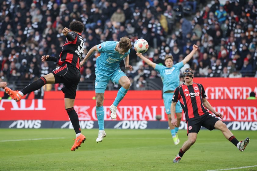 Hoffenheim a longtemps peiné à imposer son pressing habituel face aux variations tactiques de l’Eintracht, alternant défense à trois et à quatre. La première vraie occasion des visiteurs est venue sur coup de pied arrêté. Kabak a trouvé le poteau de la tête (21ème). Les Kraichgauer sont ensuite monté en puissance, sans réussir à battre Kaua Santos, décisif devant Asllani (39ème) puis Burger (45ème +1). Frankfurt a conservé son avantage jusqu’à la pause.