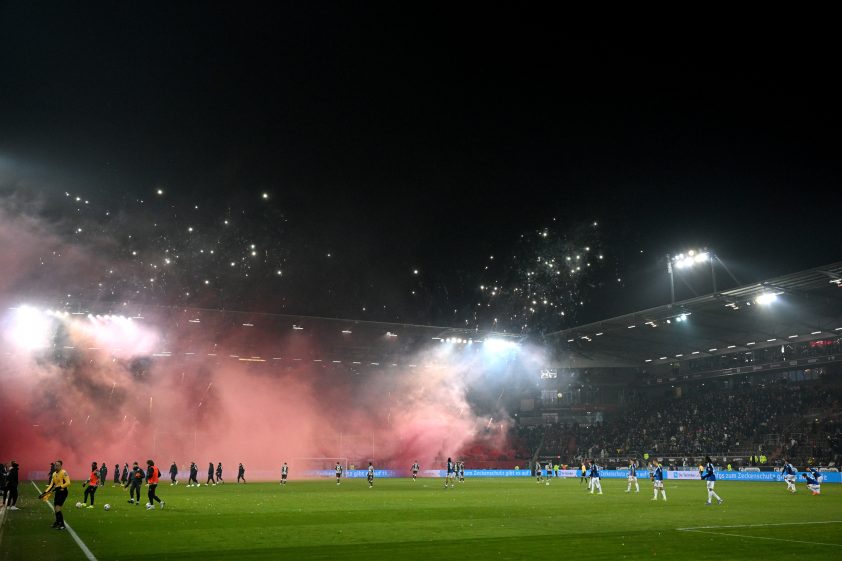 HAMBURG, GERMANY - JANUARY 23: Fans let off fireworks during the Bundesliga match between FC St. Pauli and Hamburger SV at Millerntor Stadium on January 23, 2026 in Hamburg, Germany. (Photo by Stuart Franklin/Getty Images)